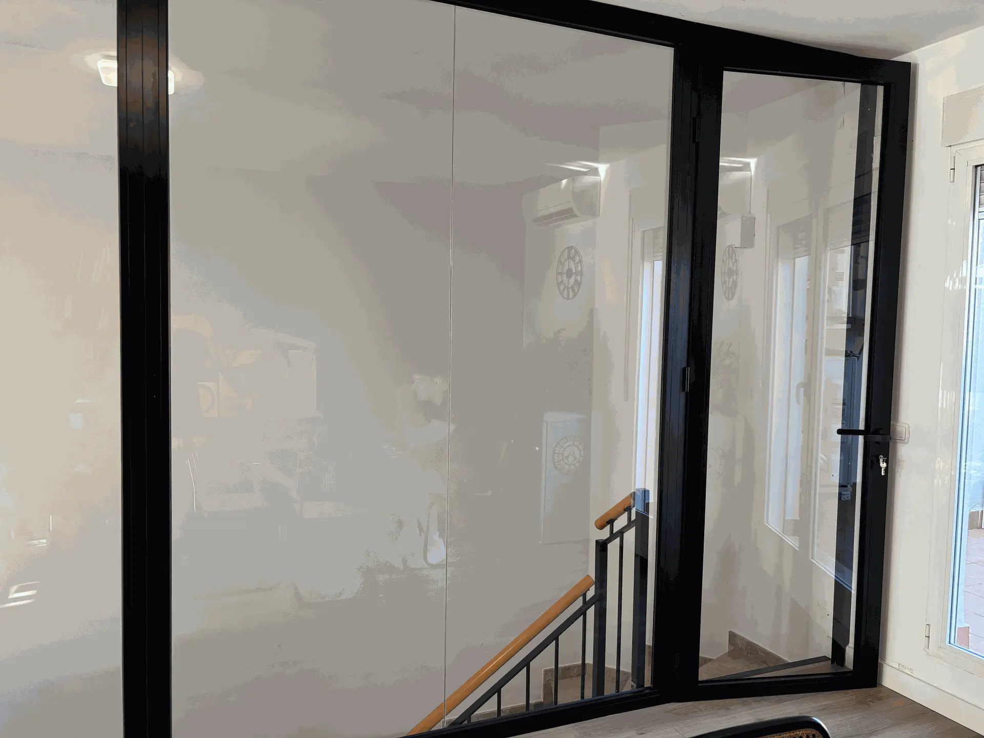 🔹 Estructura: se fabricó en perfilería de aluminio lacado en color negro (RAL 9005), aportando un acabado moderno y sobrio que combina a la perfección con el entorno interior.
